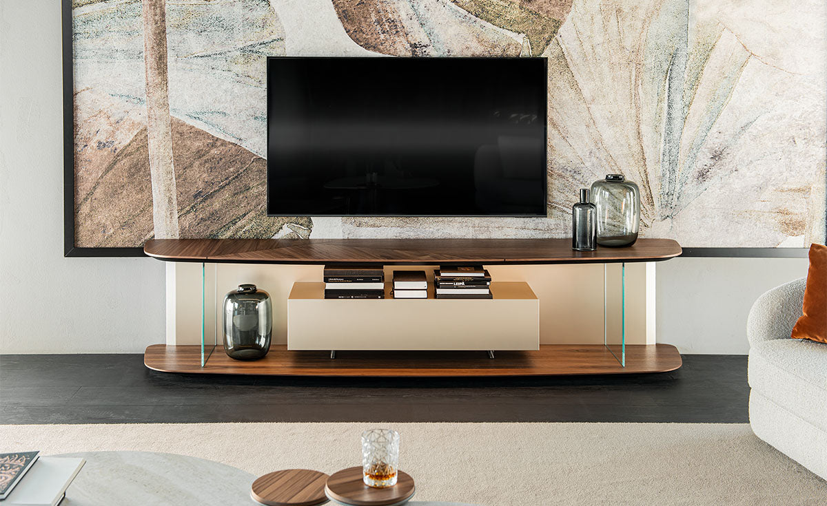 TV Cabinet with frame and drawers in titanium (M11) or bronze (GF18) wood, and extra clear bevelled glass sides. Top in Canaletto walnut (NC) with details in burned oak or burned oak (RB) with details in Canaletto walnut. Bottom in Canaletto walnut (NC) or burned oak (RB). Led lights.