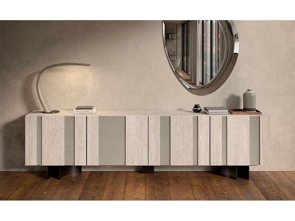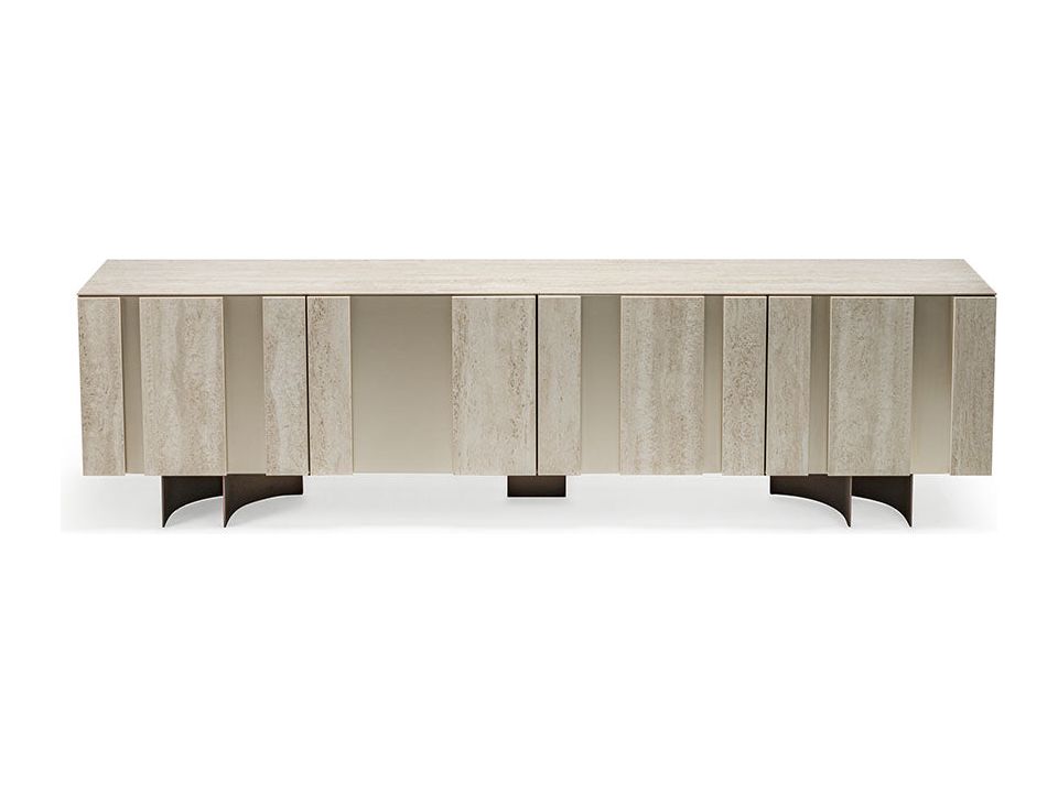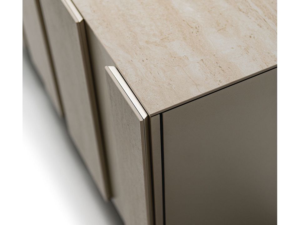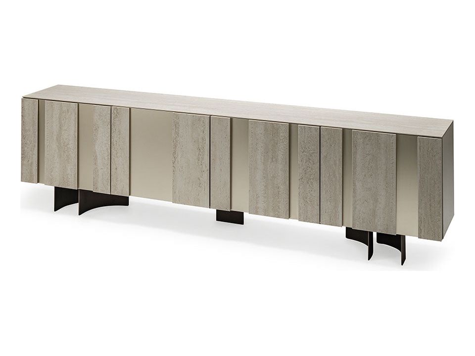 Sideboard 2, 3 or 4 doors with structure in titanium (M11) lacquered wood. Doors in titanium (M11) lacquered wood with Marmi Colosseo (KM21) ceramic inserts. Feet in titanium (GFM11) or bronze (GFM18) embossed lacquered steel. Top in Marmi Colosseo (KM21) ceramic. Internal shelves in clear glass. Optional: internal drawer in each door.