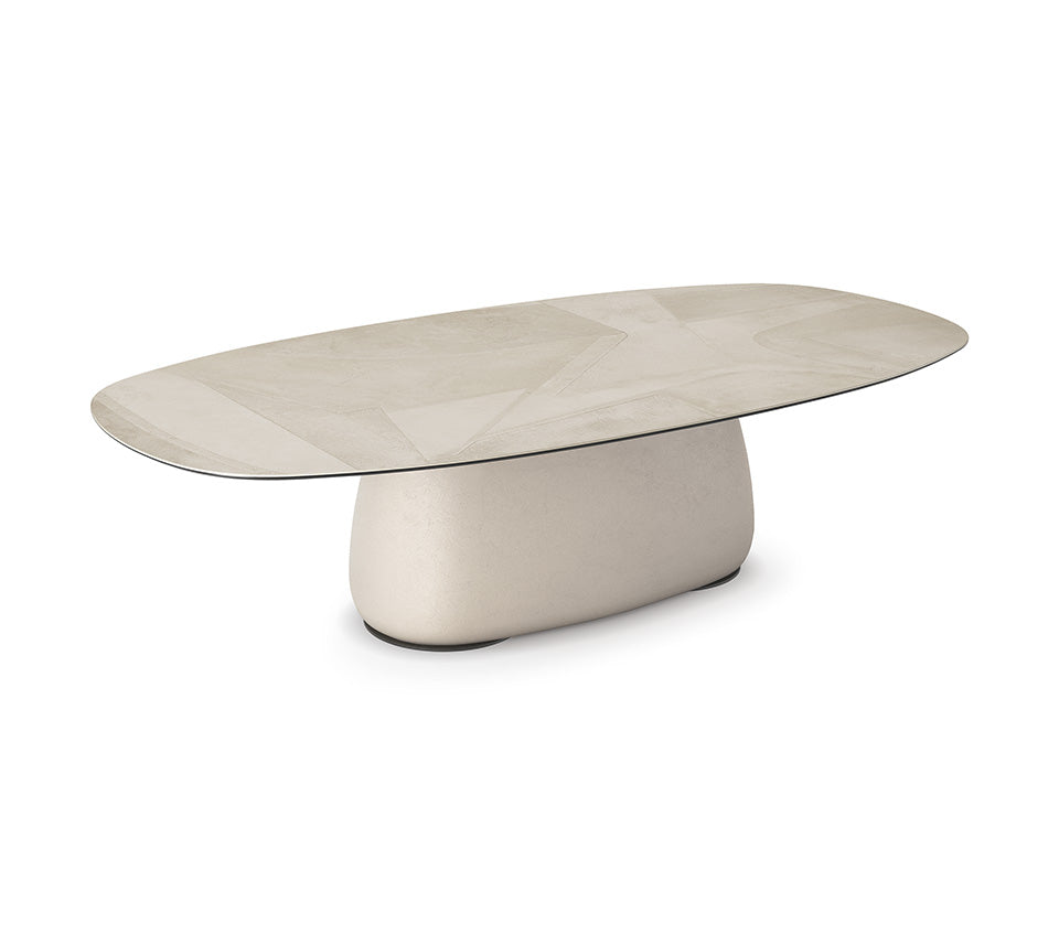 Table with base in polymer clay-spatulated in colours Cairo (AR05), Oslo (AR09) or Marrakech (AR11). Base plate in titanium (GFM11), bronze (GFM18) or black (GFM73) embossed lacquered steel. Top in ceramic Marmi Alabastro (KM02), matt Golden Calacatta (KM05), glossy Golden Calacatta (KM06), matt Portoro (KM07), glossy Portoro (KM08), glossy Sahara Noir (KM09), Makalu (KM11), Breccia (KM12), Corcovado (KM14), Kaindy (KM16), matt Borghini Calacatta (KM18), glossy Borghini Calacatta (KM19), Colosseo (KM21), Andromeda (KM22), matt Invisible (KM24) or Luxor (KS23).