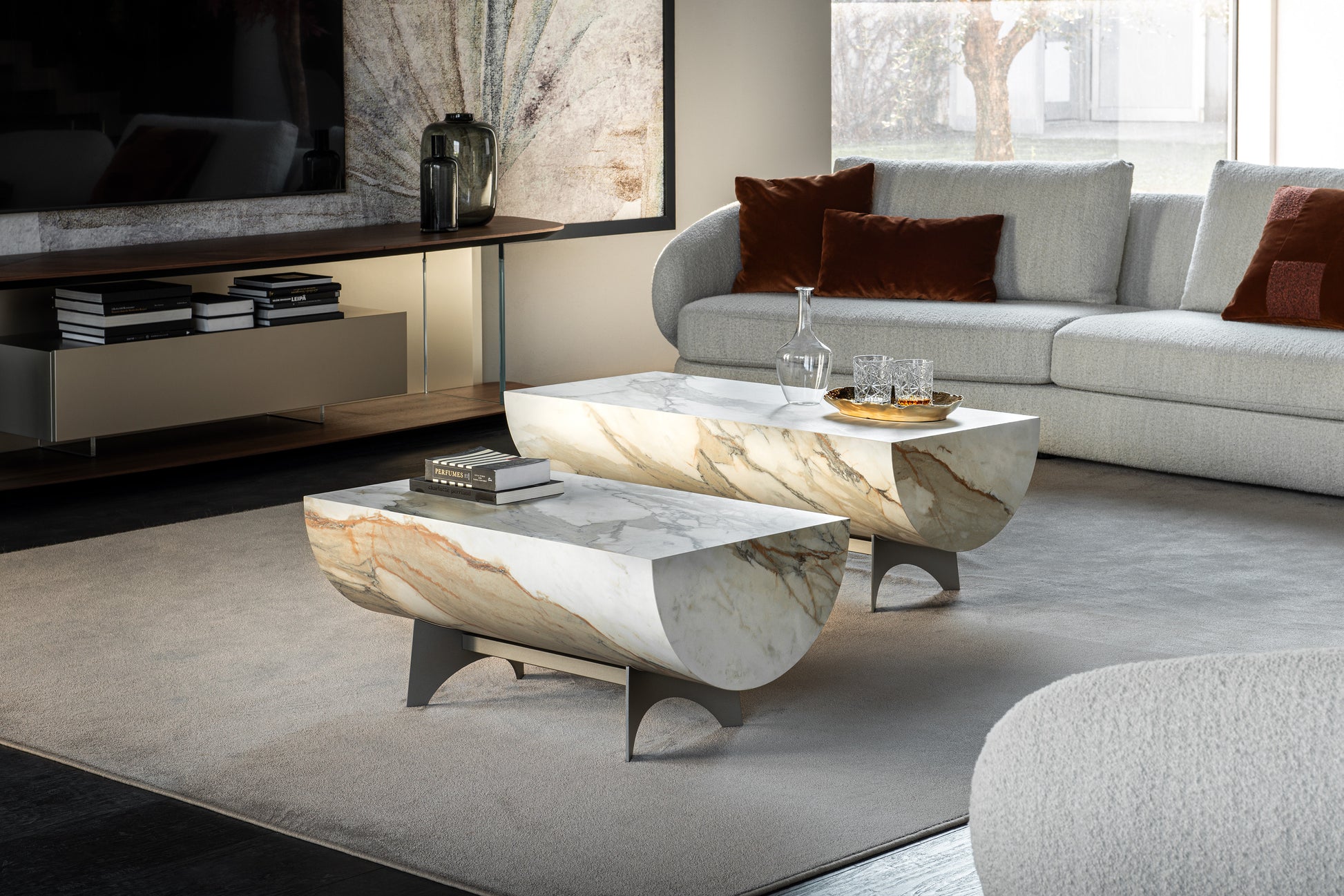 Coffee table in ceramic Marmi matt Portoro (KM07), matt Borghini Calacatta (KM18) or Colosseo (KM21). Base in titanium (GFM11) or bronze (GFM18) embossed lacquered steel