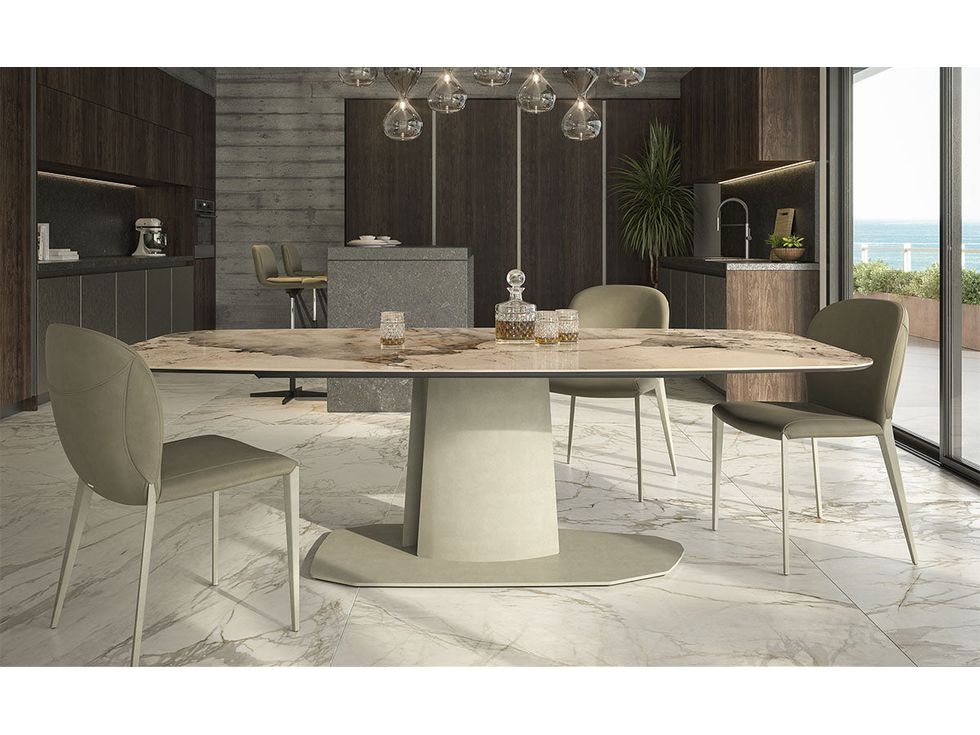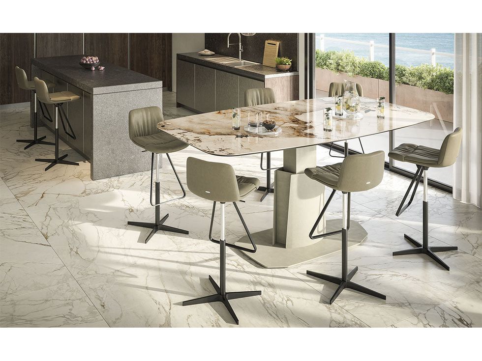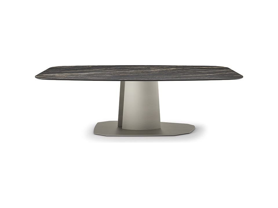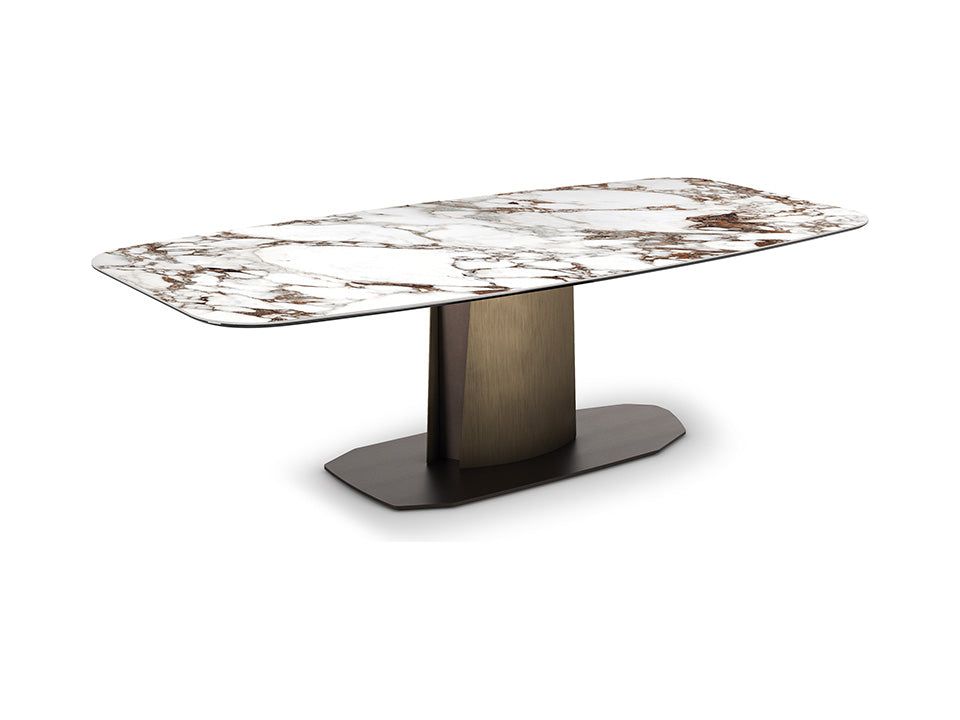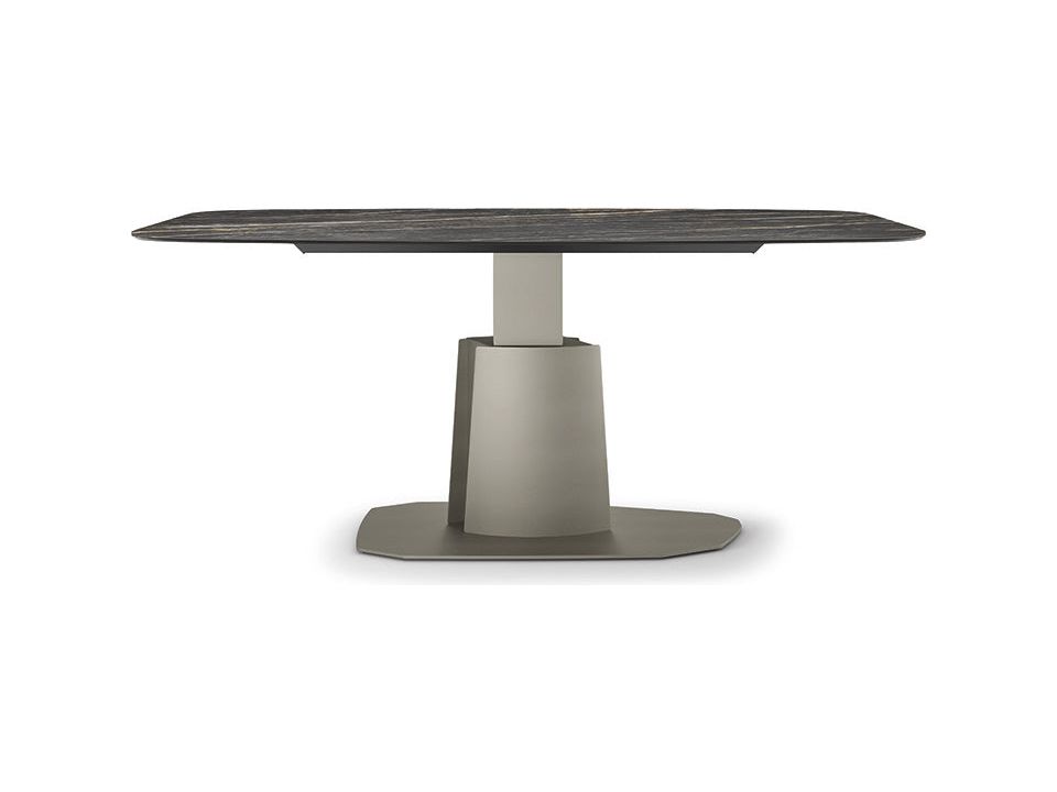 Table with electrically adjustable height. Frame in embossed lacquered titanium (GFM11), bronze (GFM18) or bronze (GFM18) - Oxybrass steel. Top in ceramic Marmi Alabastro (KM02), Supreme (KM03), matt Golden Calacatta (KM05), glossy Golden Calacatta (KM06), matt Portoro (KM07), glossy Portoro (KM08), glossy Sahara Noir (KM09), Makalu (KM11), Breccia (KM12), Arenal (KM13), Corcovado (KM14), Kaindy (KM16), matt Borghini Calacatta (KM18), glossy Borghini Calacatta (KM19), Colosseo (KM21), Andromeda (KM22), matt Invisible (KM24) or Luxor (KS23). Optional: battery and battery charger.