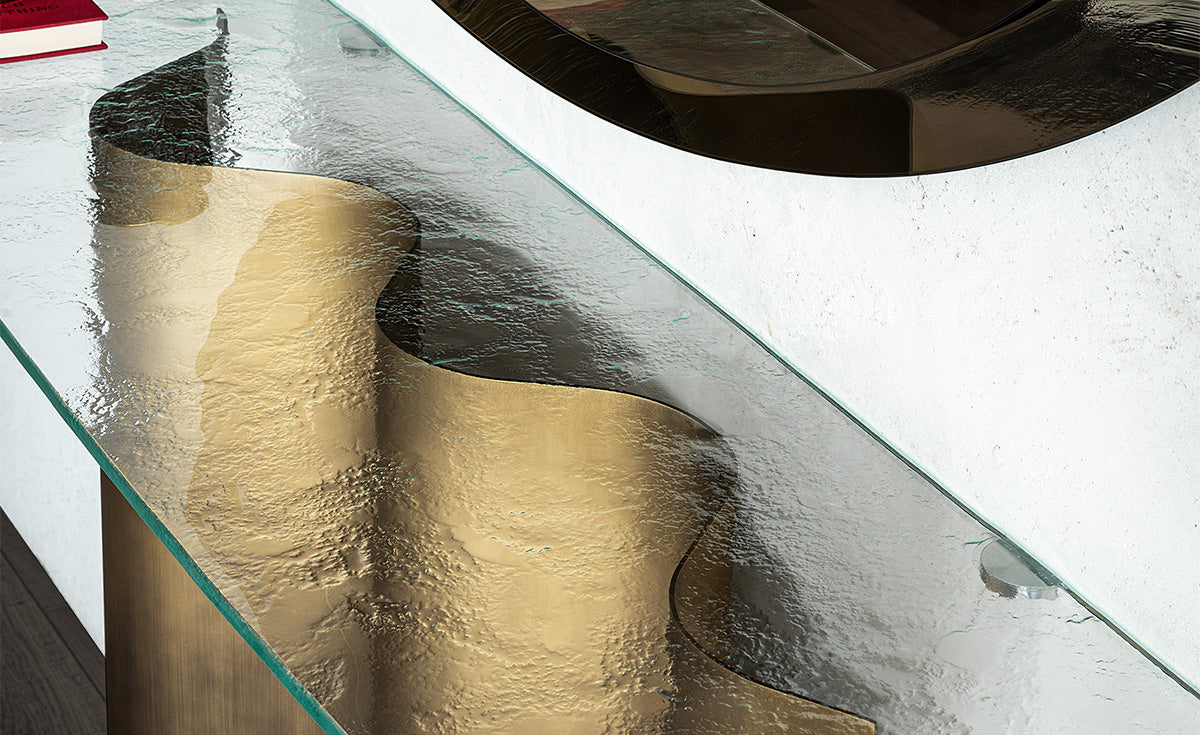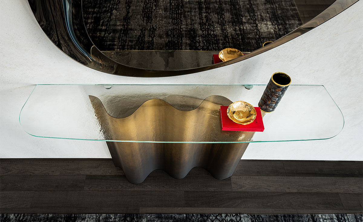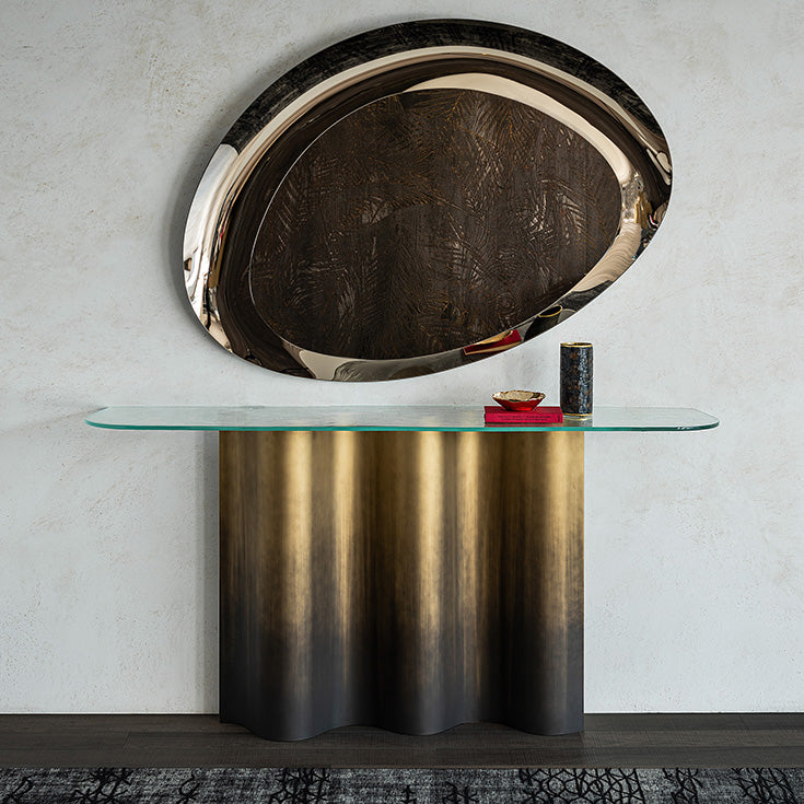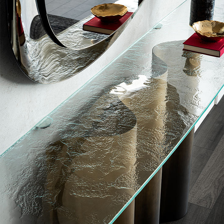 Console with base in Oxybrass or Oxygrey lacquered steel. Top in 12mm extra clear or extra clear textured (MIST) glass, laid on the base. Wall anchorage is necessary.
