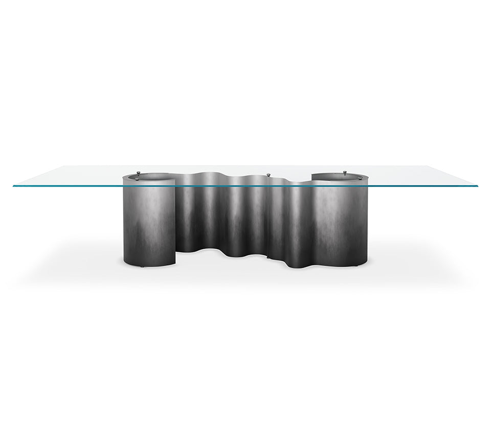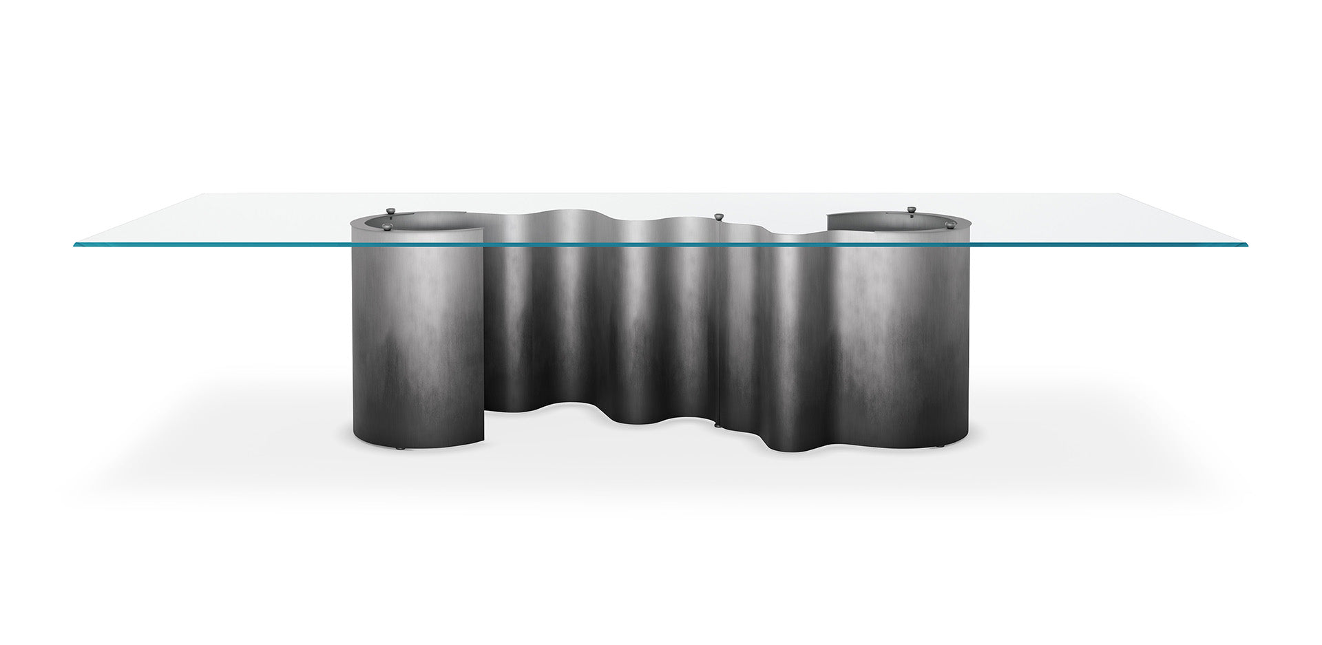Table with base in titanium (GFM11) or bronze (GFM18) embossed lacquered steel, Oxybrass or Oxygrey lacquered steel. Top in 15mm extra clear glass with reversed bevelled edges. The top is laid on the base.