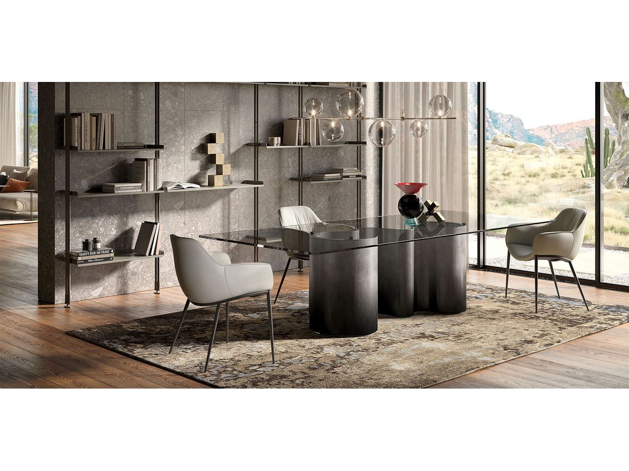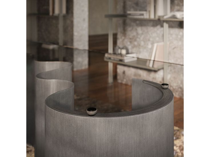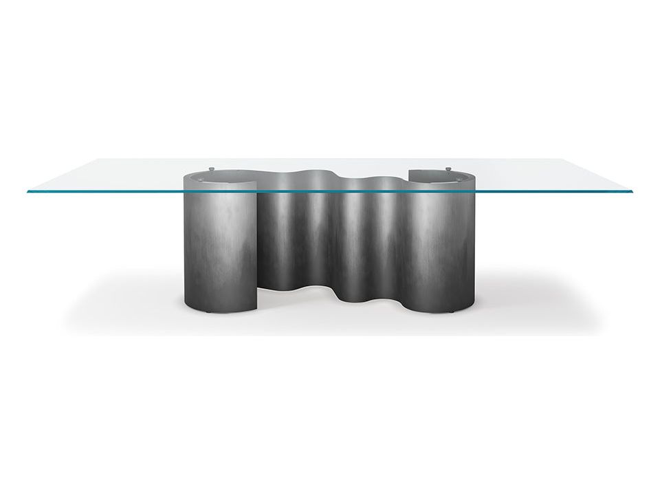 Table with base in titanium (GFM11) or bronze (GFM18) embossed lacquered steel, Oxybrass or Oxygrey lacquered steel. Top in 15mm clear, extra clear or extra clear glass with reversed bevelled edges. The top is laid on the base