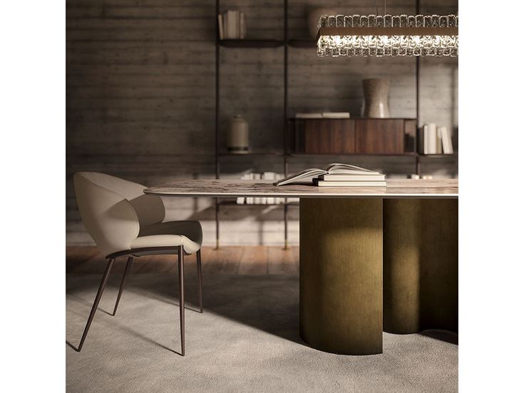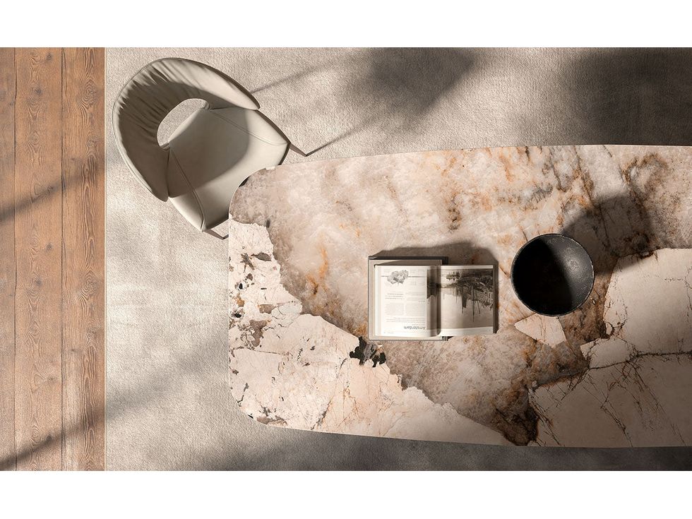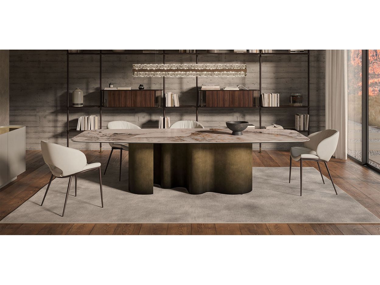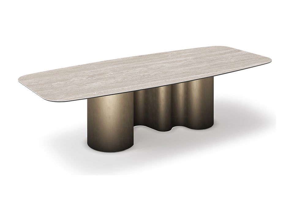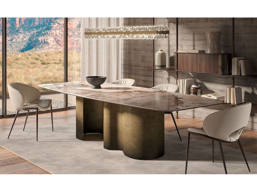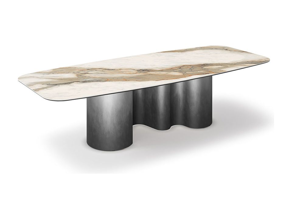 Table with embossed lacquered titanium (GFM11), bronze (GFM18), Oxybrass or Oxygrey steel base. Top in ceramic Marmi Alabastro (KM02), Supreme (KM03), matt Golden Calacatta (KM05), glossy Golden Calacatta (KM06), matt Portoro (KM07), glossy Portoro (KM08), glossy Sahara Noir (KM09), Makalu (KM11), Breccia (KM12), Corcovado (KM14), Kaindy (KM16), matt Borghini Calacatta (KM18), glossy Borghini Calacatta (KM19), Colosseo (KM21), Andromeda (KM22), matt Invisible (KM24) or Luxor (KS23).The top is laid on the base