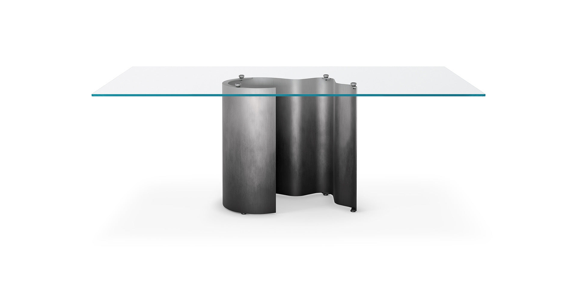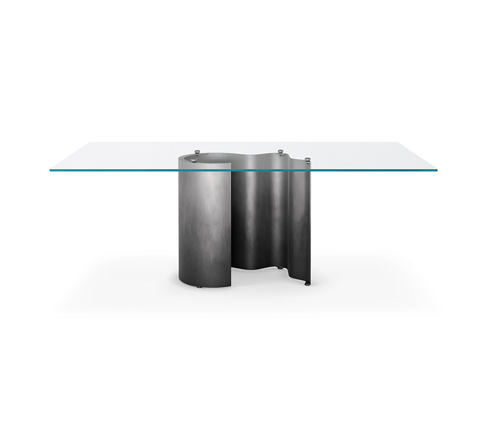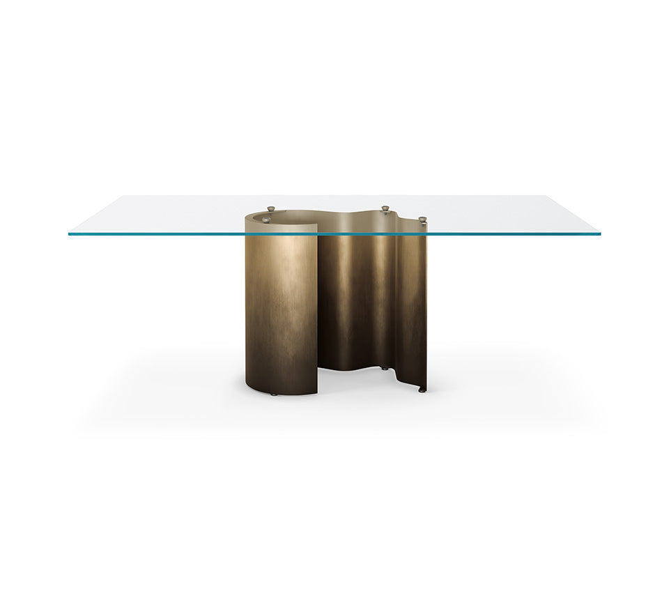Table with base in titanium (GFM11) or bronze (GFM18) embossed lacquered steel, Oxybrass or Oxygrey lacquered steel. Top in 15mm clear or extra clear Glass. Glass top 12mm on 160x90, 182x90 and 200x106 versions. The top is laid on the base.
