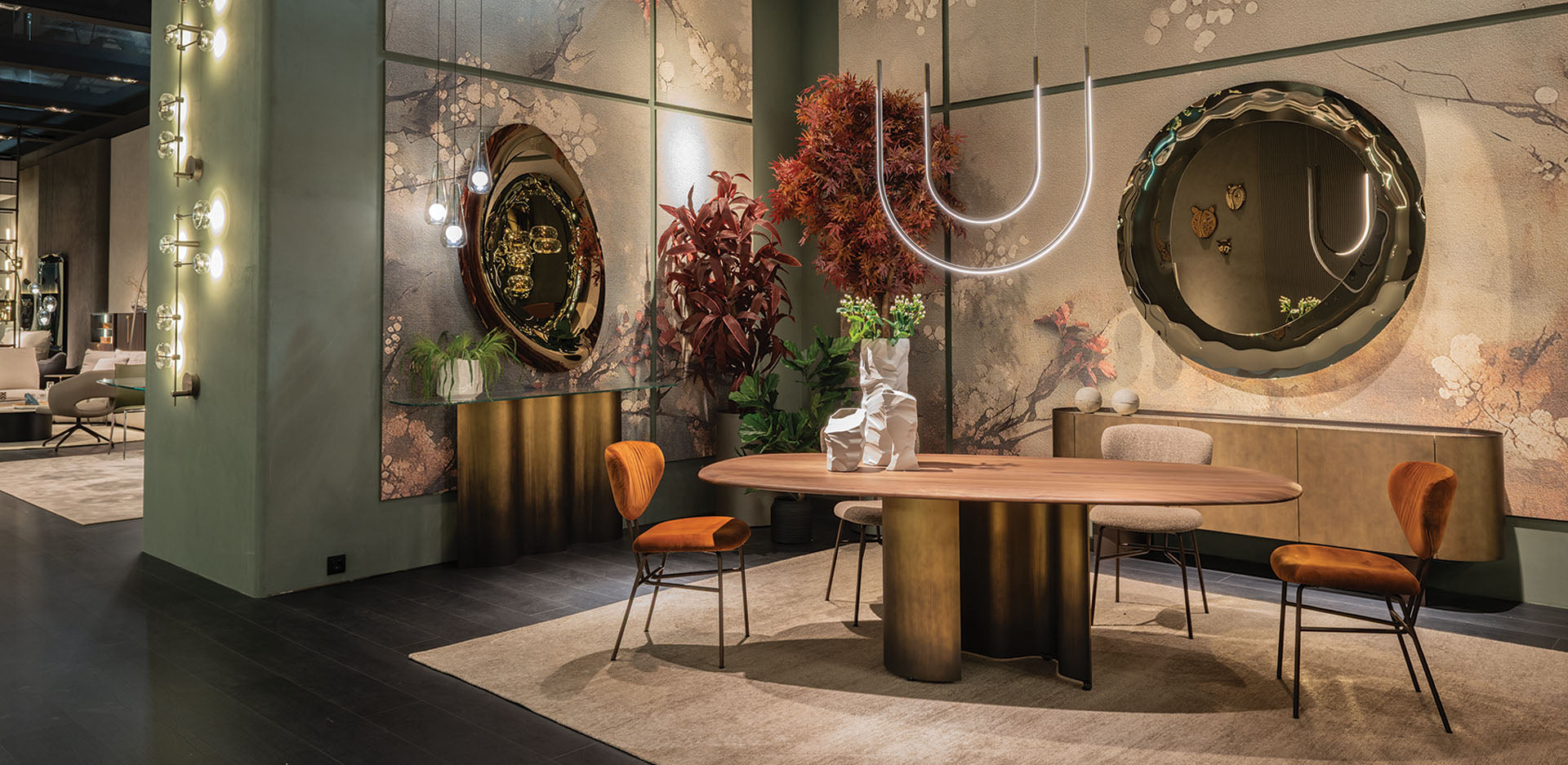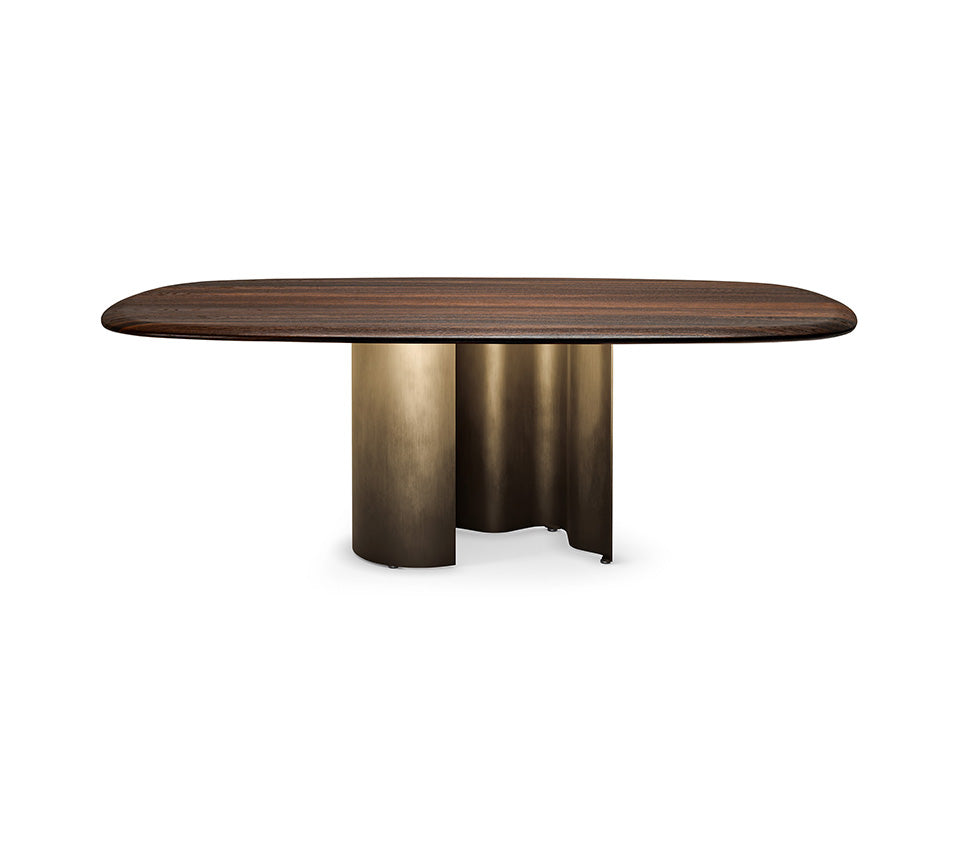 Table with base in titanium (GFM11) or bronze (GFM18) embossed lacquered steel, Oxybrass or Oxygrey lacquered steel. Version "U": top with rounded edges in Canaletto walnut (NC) or burned oak (RB). Version "Y": with bevelled edges in Canaletto walnut (NC) with details in burned oak or burned oak (RB) with details in Canaletto walnut.