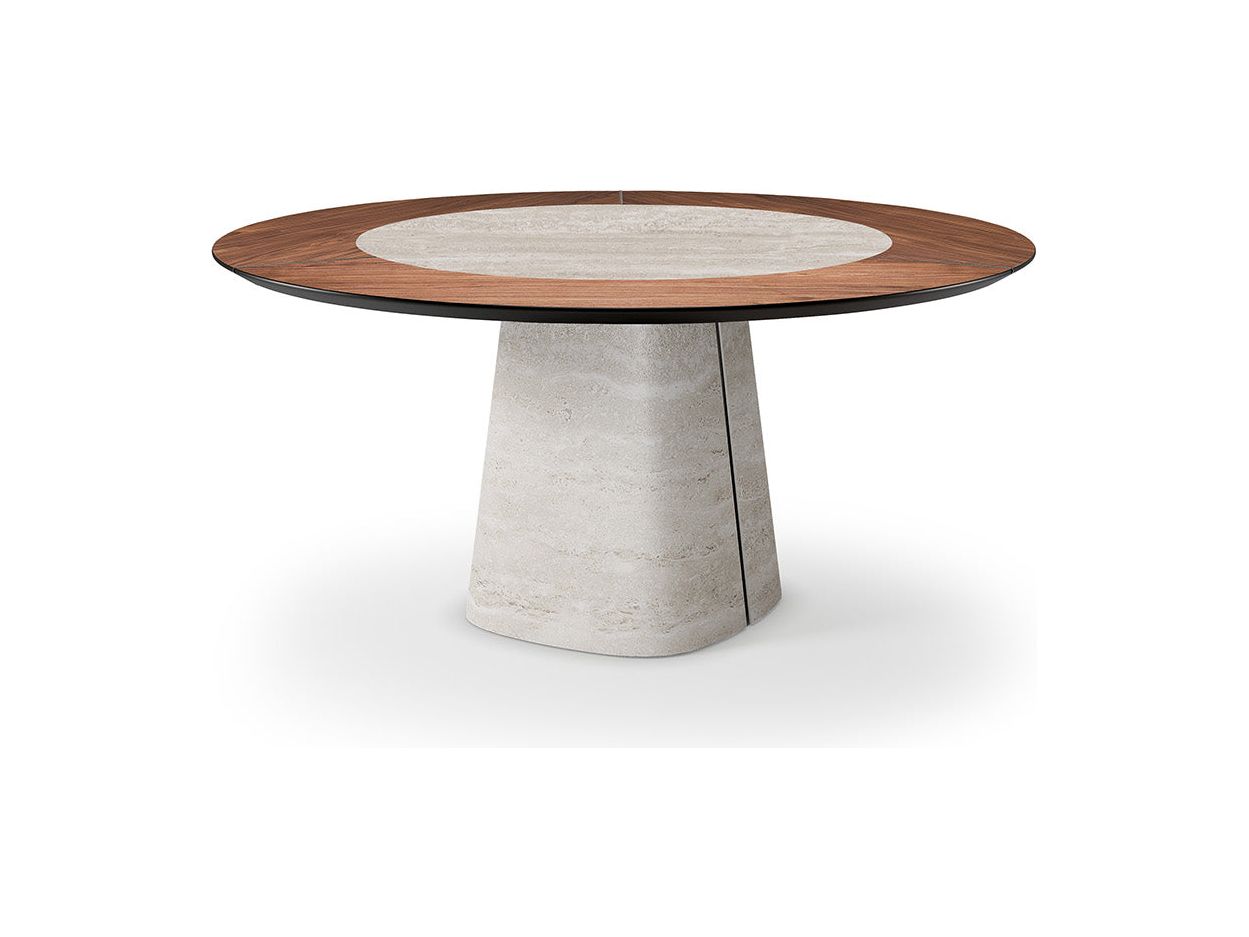 Table with base in ceramic Marmi matt Portoro (KM07), Colosseo (KM21) or matt Invisible (KM24). Top in Canaletto walnut (NC) or burned oak (RB) with insert in ceramic Marmi matt Portoro (KM07), Colosseo (KM21) or matt Invisible (KM24). Black chrome (06) details. "T" version with swiveling ceramic insert. Imperfections, colour variations and irregularities on the base are characteristics of the workmanship and are not to be considered defects.
