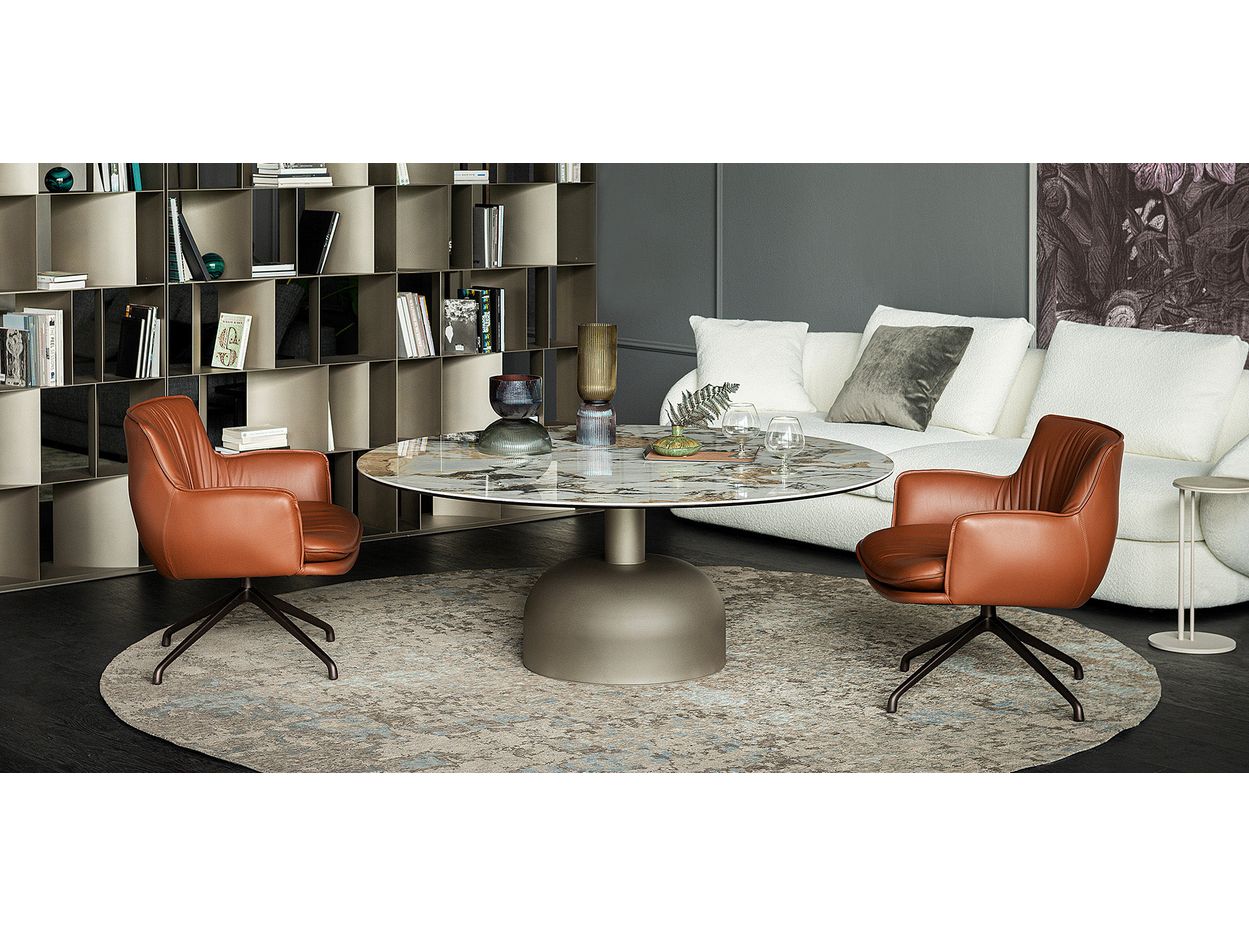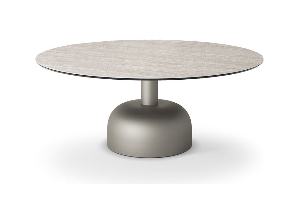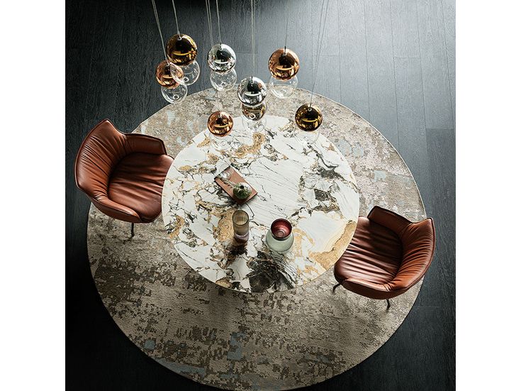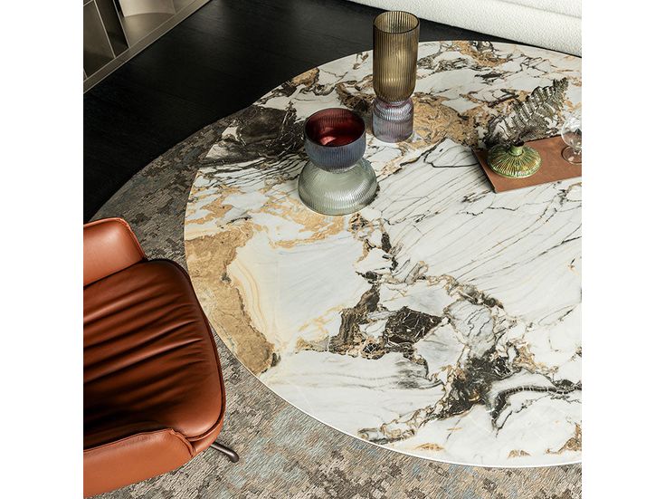 Table with base in titanium (GFM11) or bronze (GFM18) embossed lacquered steel. Marmi Alabastro (KM02), Supreme (KM03), matt Golden Calacatta (KM05), glossy Golden Calacatta (KM06), matt Portoro (KM07), glossy Portoro (KM08), glossy Sahara Noir (KM09), Makalu (KM11), Breccia (KM12), Colosseo (KM21), Andromeda (KM22), matt Invisible (KM24) or Luxor (KS23) ceramic top. Optional central swiveling tray Lazy Susan