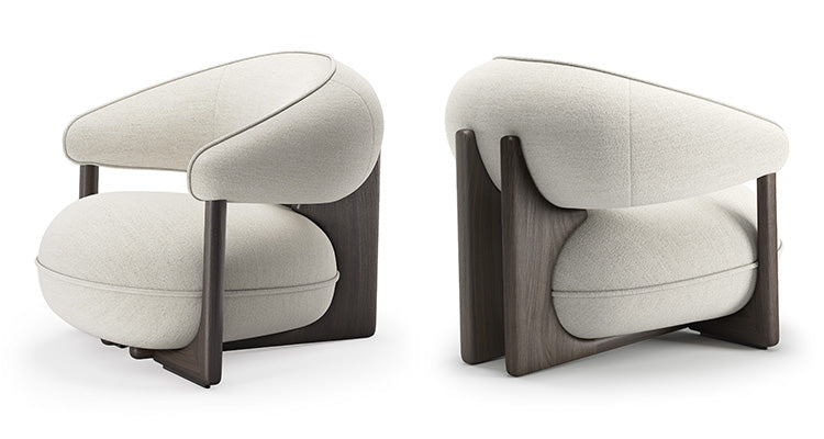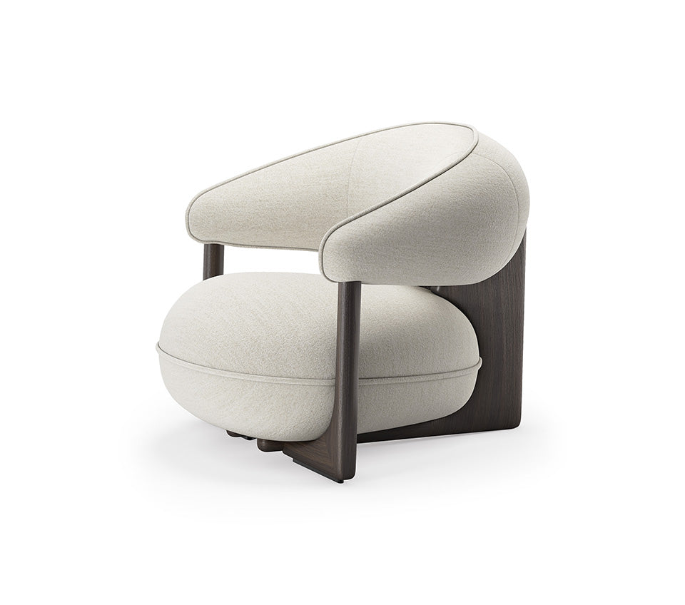 Armchair with base in Canaletto walnut stained ashwood (frNC) or burned oak stained ashwood (frRB). Cover in fabric, micro nubuck or soft leather as per sample card. The cover is not removable