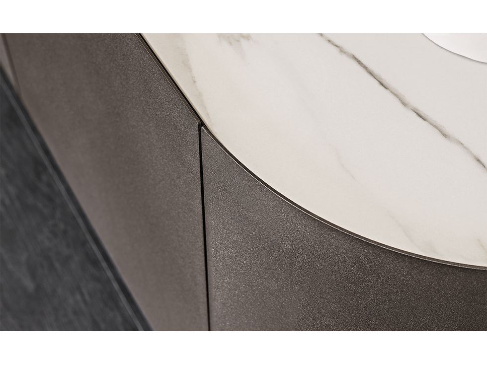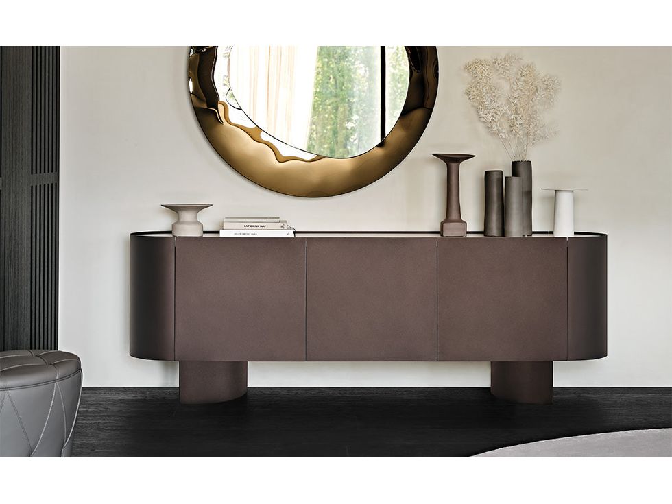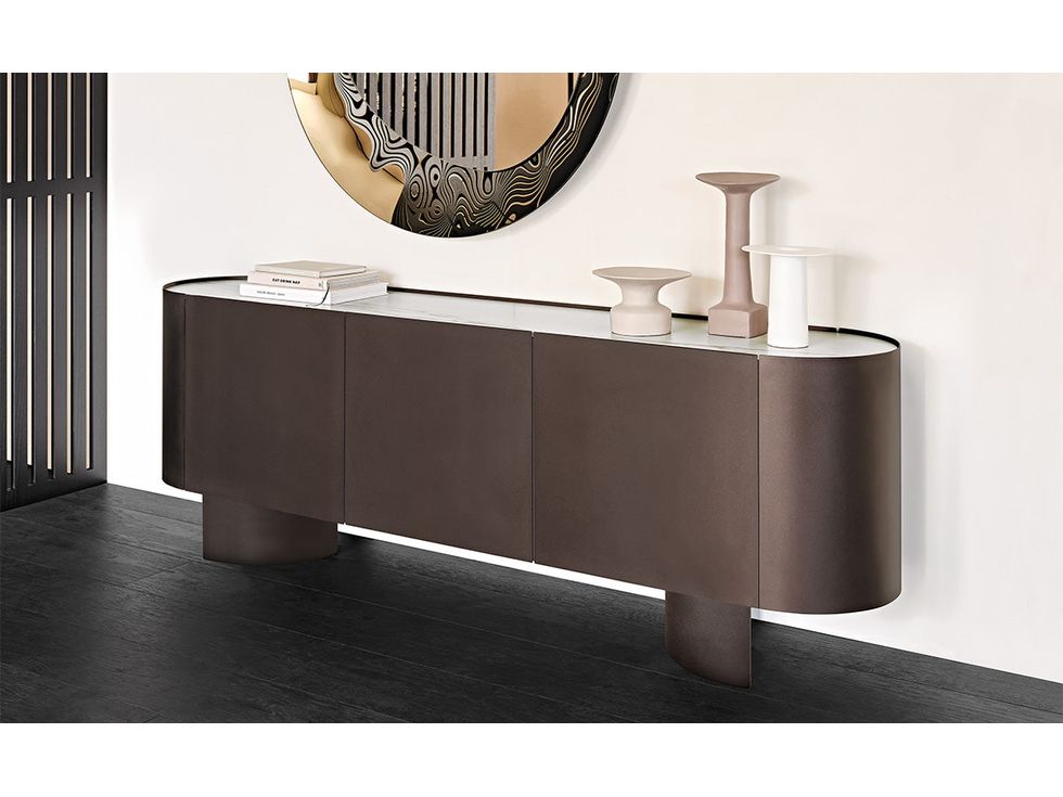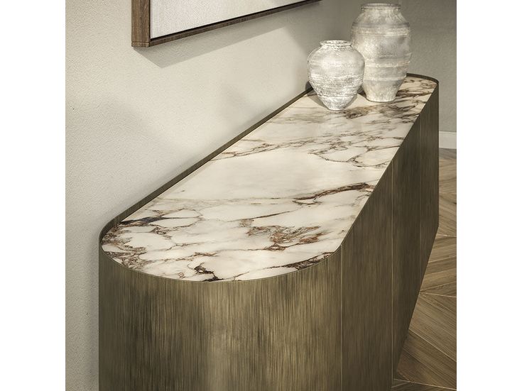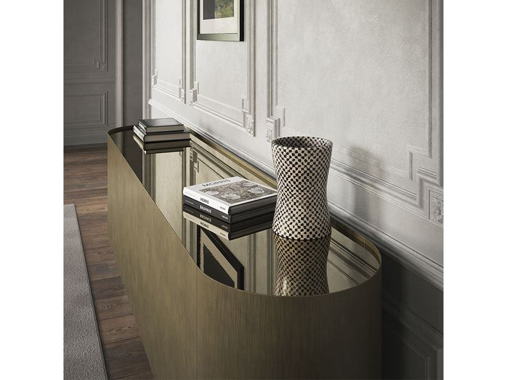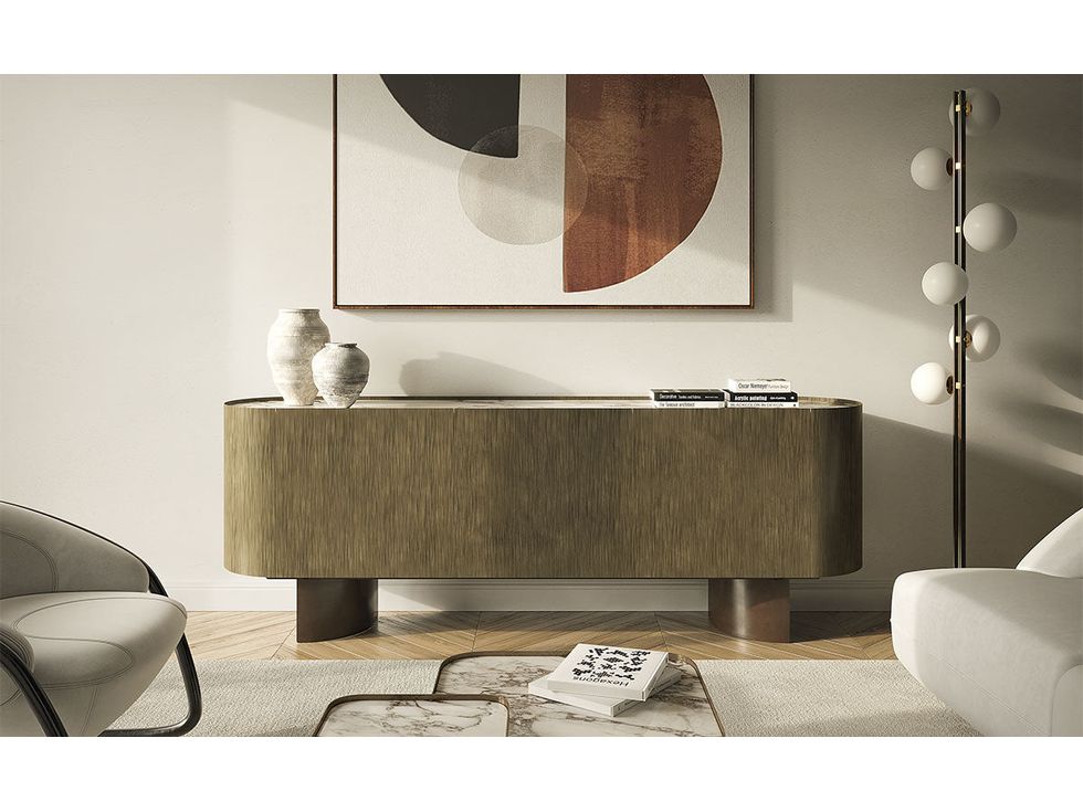 Sideboard with wood frame covered in bronze (GFM18) or Oxybrass embossed lacquered steel. Top in bronze mirrored glass or in ceramic Marmi matt Golden Calacatta (KM05), glossy Golden Calacatta (KM06), matt Portoro (KM07), glossy Portoro (KM08), Breccia (KM12) or Colosseo (KM21). Feet in bronze (GFM18) embossed painted steel. Internal shelves