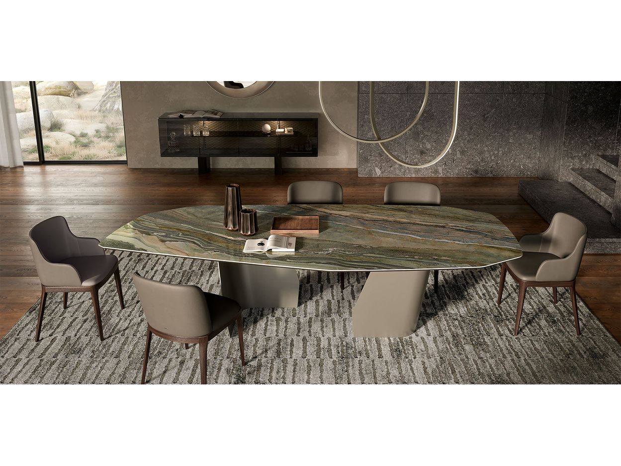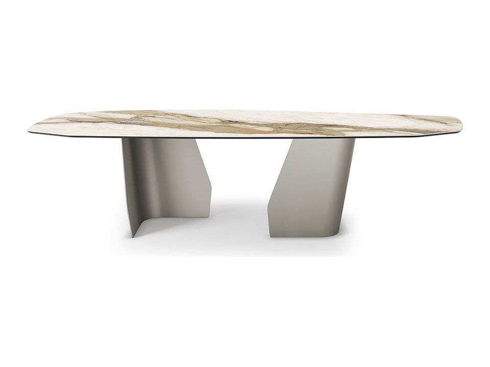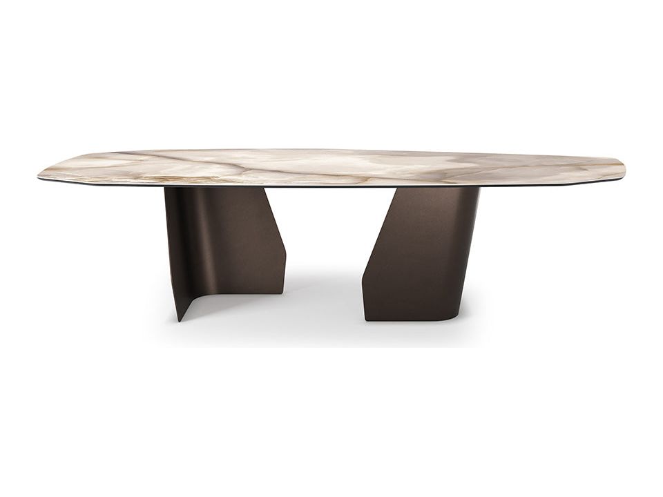 Table with embossed lacquered titanium (GFM11) or bronze (GFM18) steel base. Top in ceramic Marmi Alabastro (KM02), Supreme (KM03), matt Golden Calacatta (KM05), glossy Golden Calacatta (KM06), matt Portoro (KM07), glossy Portoro (KM08), glossy Sahara Noir (KM09), Makalu (KM11), Breccia (KM12), Corcovado (KM14), Kaindy (KM16), matt Borghini Calacatta (KM18), glossy Borghini Calacatta (KM19), Colosseo (KM21), Andromeda (KM22), matt Invisible (KM24) or Luxor (KS23). The top is laid on the base