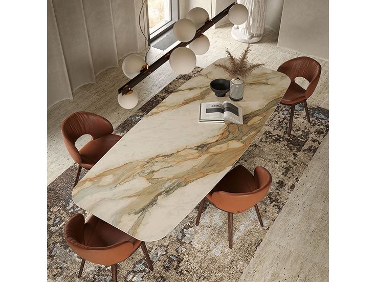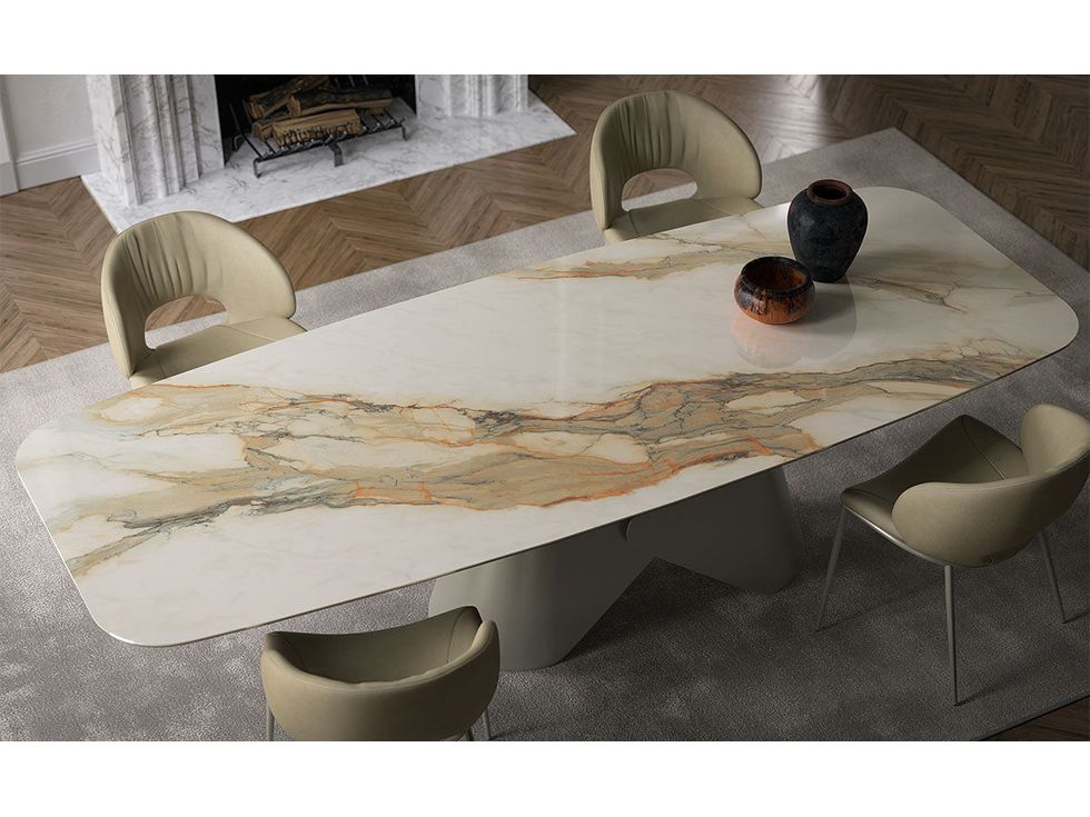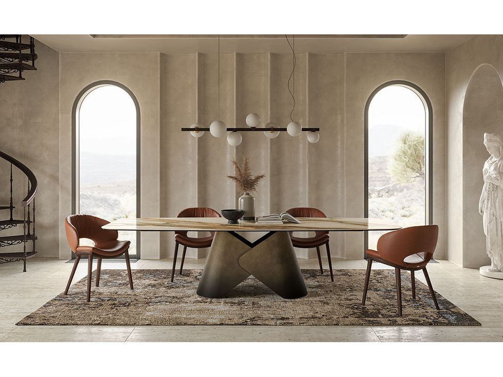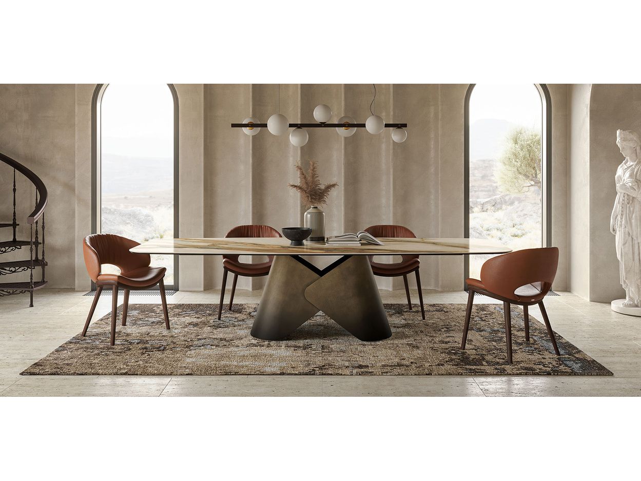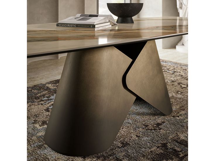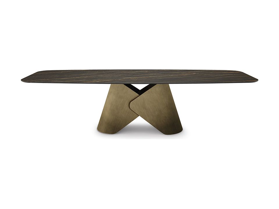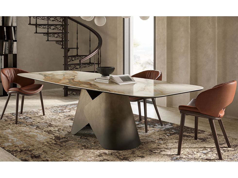 Table with embossed lacquered titanium (GFM11), bronze (GFM18) or Oxybrass steel base. Top in ceramic Marmi Alabastro (KM02), Supreme (KM03), matt Golden Calacatta (KM05), glossy Golden Calacatta (KM06), matt Portoro (KM07), glossy Portoro (KM08), glossy Sahara Noir (KM09), Makalu (KM11), Breccia (KM12), Arenal (KM13), Corcovado (KM14), Kaindy (KM16), matt Borghini Calacatta (KM18), glossy Borghini Calacatta (KM19), Colosseo (KM21), Andromeda (KM22), matt Invisible (KM24) or Luxor (KS23).