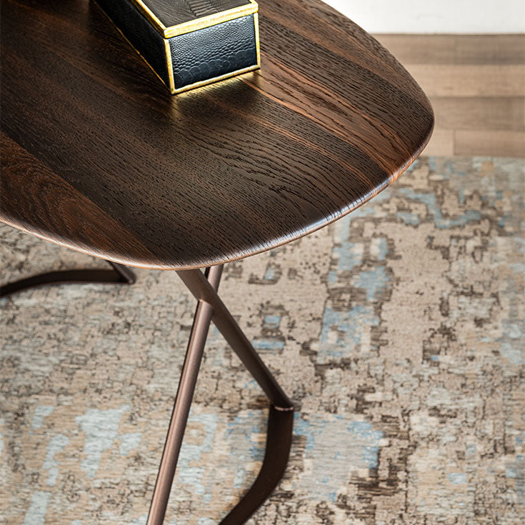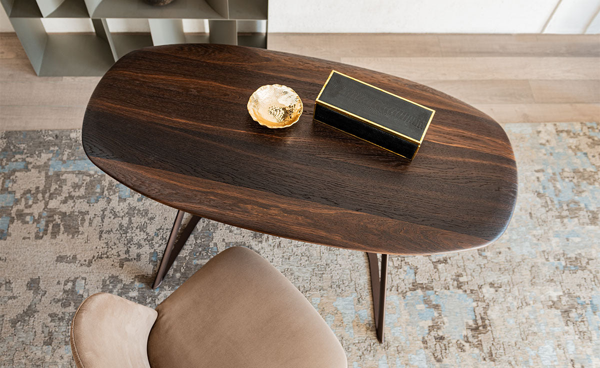 Desk with base in titanium (GFM11) or bronze (GFM18) embossed lacquered steel. Top with rounded edges (U) in Canaletto walnut (NC) or burned oak (RB).