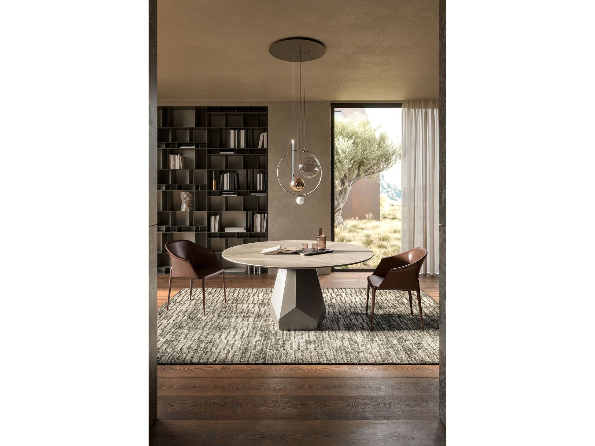 Table with base in titanium (GFM11) or bronze (GFM18) embossed lacquered steel. Marmi Alabastro (KM02), Supreme (KM03), matt Golden Calacatta (KM05), glossy Golden Calacatta (KM06), matt Portoro (KM07), glossy Portoro (KM08), glossy Sahara Noir (KM09), Makalu (KM11), Breccia (KM12), Corcovado (KM14), Kaindy (KM16), matt Borghini Calacatta (KM18), glossy Borghini Calacatta (KM19), Colosseo (KM21), Andromeda (KM22), matt Invisible (KM24) or Luxor (KS23) ceramic top. Optional central swiveling tray Lazy Susan.